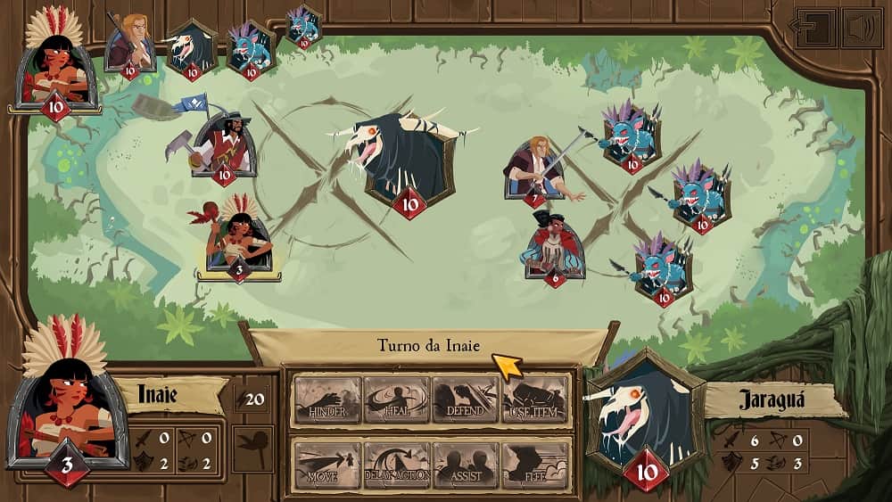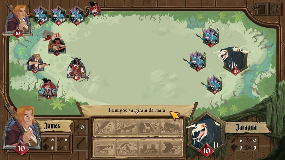 - Batalhas estilo RPG, em turnos e rodadas com ações e escolhas táticas;