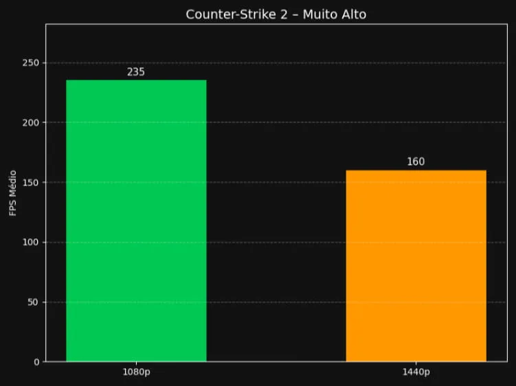Counter-Strike 2 é um exemplo de jogo competitivo e mais leve que os demais dessa lista. Ele vai bem mesmo que eu coloque os seus gráficos no máximo possível e sem upscaling. Para quem busca uma máquina com a RTX 5060 voltada para CS2 e muitos frames, aqui é sem erro.