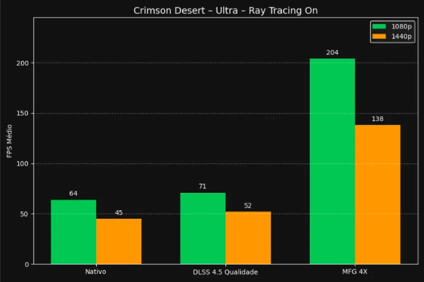 Ainda assim, fiquei surpreso: em 1080p o jogo realmente vai bem. Um pouco complicado no nativo pela média de 64 FPS, mas brilha com a tecnologia da Nvidia. Em 1440p, já recomendo ir direto ativar o DLSS 4.5 em Qualidade e o Multi Frame Generation, pois, principalmente em momentos onde o mundo aberto tem muitos elementos para carregar, é onde mais precisamos dessa tecnologia para manter os FPS de forma satisfatória.